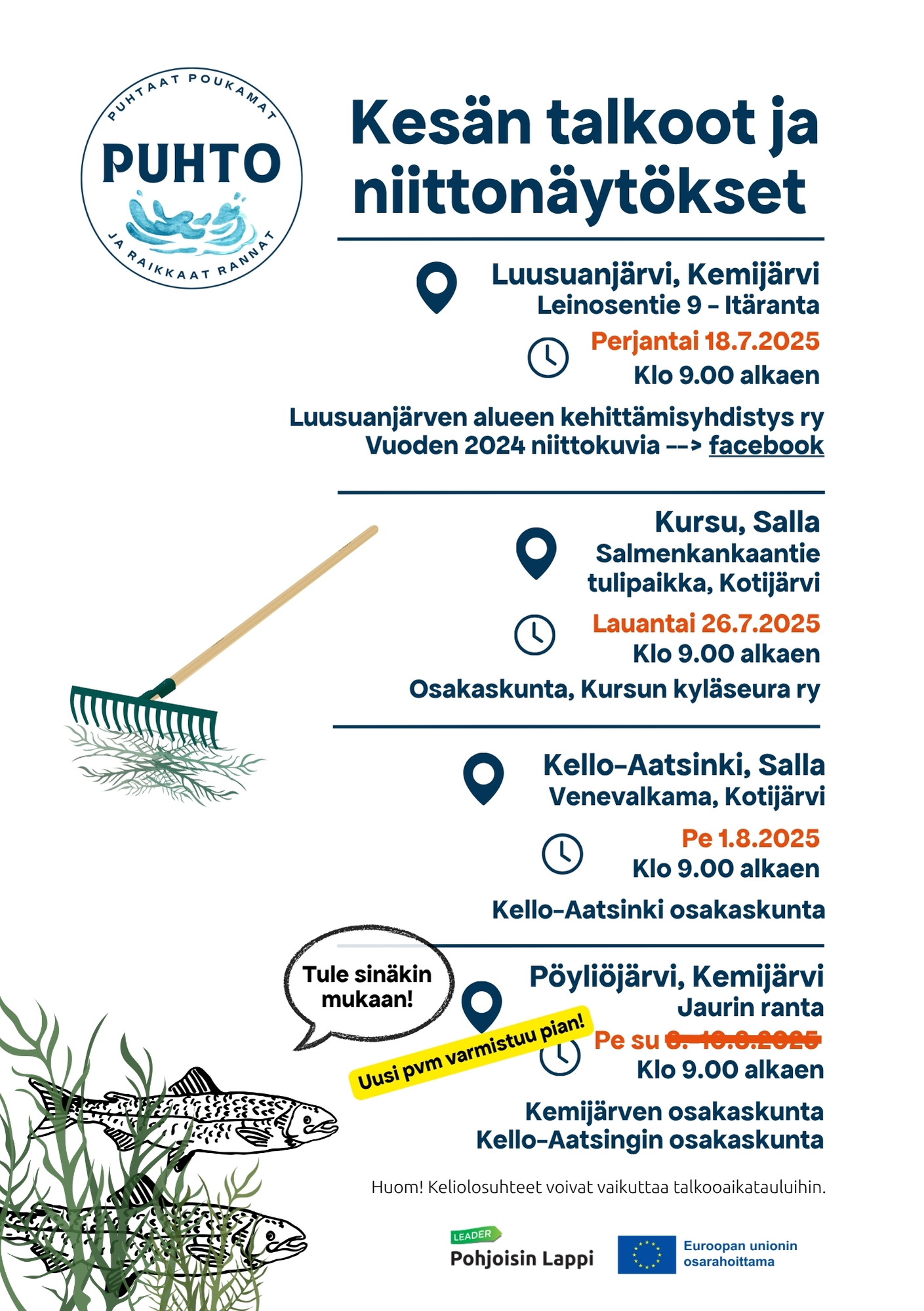 Puhtaat poukamat ja raikkaat rannat -hanke (PUHTO) tukee paikallisia yhteisöjä vesistöjen kunnostuksessa ja osallistuu talkoisiin. Tule sinäkin mukaan talkoilemaan, verkostoitumaan, sekä tutustumaan niittotöihin ja niitossa käytettävään kalustoon!